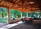 The house is a haven of peace for young and old alike, with indoor and outdoor activities available. A large garden with trees and a covered awning for outdoor meals.